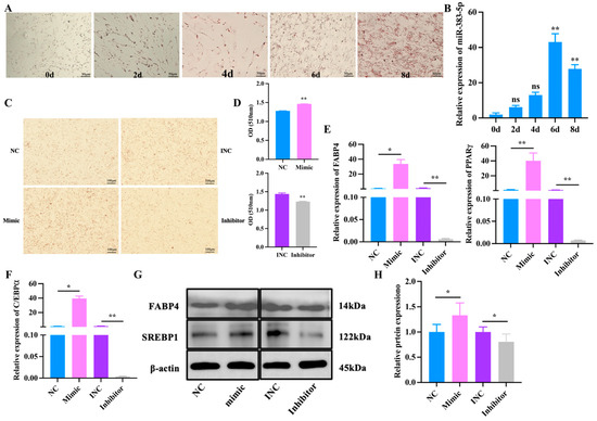 miR-383-5p promotes rabbit preadipocyte differentiation. (A) Oil Red O staining of lipid droplets at 0, 2, 4, 6, and 8 d of differentiation. (B) The relative expression levels of miR-383-5p during preadipocyte differentiation progress (n = 9). (C,D) Oil Red O staining of lipid droplets after 6 d of transfection and quantitative results of Oil Red O staining (n = 9). (E,F) The relative expression levels of PPARγ, FABP4, and C/EBPα in rabbit preadipocytes induced differentiation at 6 d after transfecting with NC, miR-383-5p mimic, INC, and miR-383-5p inhibitor (n = 9). (G,H) SREBP1 and FABP4 protein levels during preadipocyte differentiation after transfecting with NC, miR-383-5p mimic, INC, and miR-383-5p inhibitor (n = 3). The data are presented as means ± SEM. * p < 0.05; ** p < 0.01.