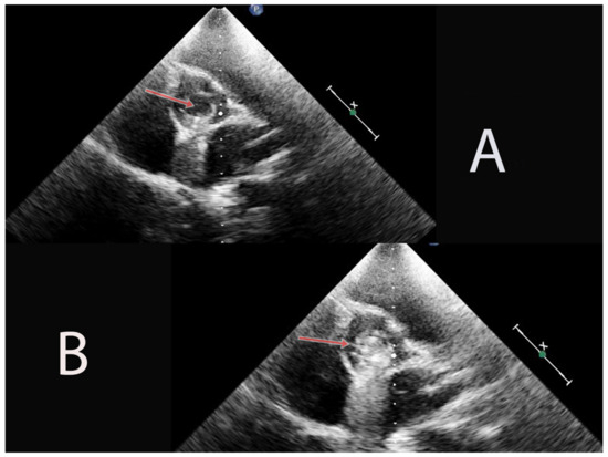 In image (A), we can see the aortic valve thickening, with reduced opening during systole (arrow). In image (B), evident presence of calcifications within the aortic valve leaflets, contributing to the narrowing of the valve orifice, as revealed by the bright, echo-dense areas with a prominent acoustic shadow (arrow).