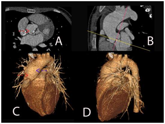Angiographic computed tomography (CT) image illustrating severe aortic valve stenosis associated with aortic bicuspidy with clear visualization of the aortic cusps and focal valve calcifications at the aortic commissure (red arrow). These calcifications are evident as bright, dense areas within the valve leaflets (A). In a sagittal plane, the ascending aorta appears significantly dilated, measuring 4.7 cm in diameter, surpassing the normal range (the colored lines were used as a guide for adjusting imaging planes to the standard cardiac planes- the pink line for the horizontal long axis and the yellow one for the short axis) (B). On the three-dimensional (3D) reconstructed angiographic computed tomography (CT) scan, we can see the dilatation of the ascending aorta. Adjacent to the dilated segment, a sacciforme aneurysm is evident (red arrow). Furthermore, the image showcases aortic ulcerations in the right anterior part of the ascending aorta (blue arrow) (C,D).