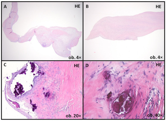 Aortic valve leaflets showing degenerative changes, with architectural distortion (A), primarily due to fibrous layer expansion (B). Also, multiple calcified foci were present (C,D). HE: Hematoxylin–Eosin staining.