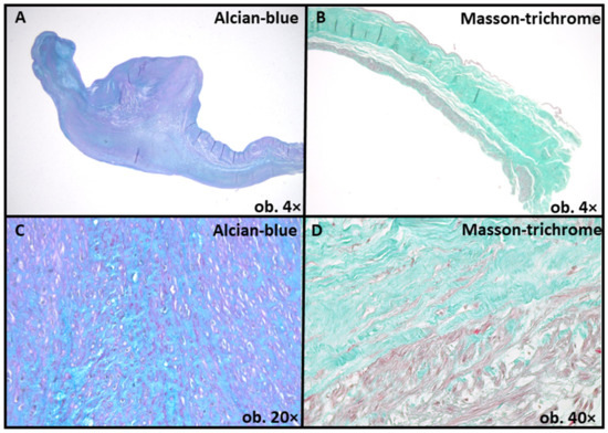 Furthermore, mucoid accumulation and fibrosis of the media in the ascending aorta wall were assessed (Figure 4 and Figure 5). For this assessment, we used the criteria suggested by the latest Consensus statement on surgical pathology of the aorta: non-inflammatory degenerative diseases-nomenclature and diagnostic criteria, published by the Society for Cardiovascular Pathology and the Association for European Cardiovascular Pathology [6]. Mucoid accumulation was assessed depending on the extension limited to (intralamellar mucoid extracellular matrix accumulation—MEMA-i) or between two adjacent lamellar units (translamellar mucoid extracellular matrix accumulation—MEMA-t). For each staining, standard protocols were used; alcian-blue staining was performed using a 2.5 pH solution method.