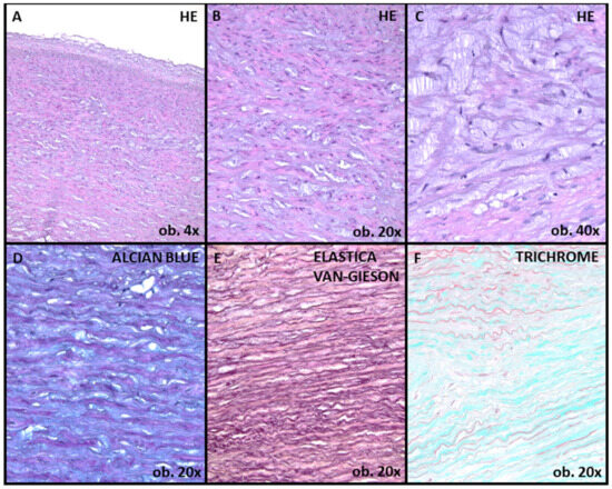 Aortic wall sections showing moderate medial degeneration (A,B). The mucoid extracellular matrix accumulation is seen, predominantly with intralamellar extension (MEMA-i) (C,D). Mild elastic fiber fragmentation and collapse, as revealed by van Gieson staining for elastin evidentiation (E). Mild medial fibrosis, as revealed by Masson-trichrome staining (F). HE: Hematoxylin–Eosin staining.