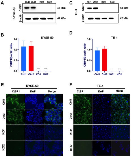 We assessed the expression levels of CtBP1 in human ESCC cells, specifically, the KYSE-50 and TE-1 cell lines. Our Western blotting results (Figure 1A–D) and immunofluorescence assay (Figure 1A,F) highlight the substantial expression of CtBP1 in ESCC cells. These observations align with previous studies that have shown the involvement of CtBP1 in various cancers, including breast, lung, and prostate cancers [18,19,20,21]. This suggests that CtBP1 may play a role in the development or progression of ESCC. Our study provides the initial evidence of CtBP1 expression in human ESCC cells, indicating its potential relevance to ESCC and broader tumorigenesis.
