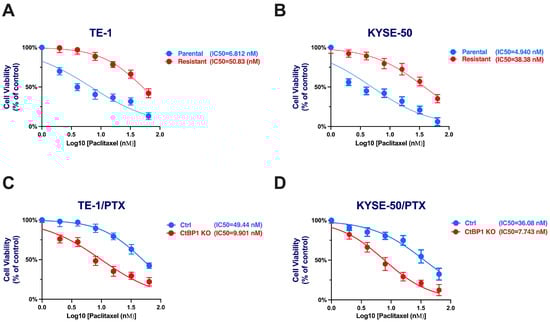 Dose–response curves for parental and PTX-resistant cell lines highlighting sensitivity disparities. (A) TE-1. (B) KYSE-50. (C,D) TE-1 and KYSE-50 categorized into Scramble control (Ctrl) and CtBP1 KO (Knockout) groups, highlighting treatment-induced changes in drug sensitivity. Experiments were conducted in triplicate, and a Student t-test was used to assess the difference between Ctrl and CtBP1 KO, as well as between parental and resistant groups. p-values < 0.05 were considered significant.
