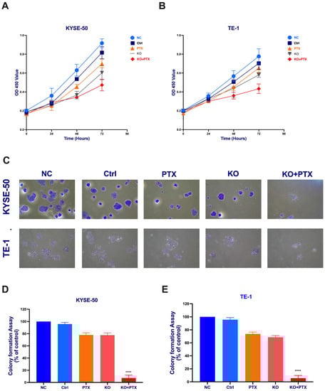 The study aimed to evaluate cell proliferation in both parental and PTX-resistant cell lines, specifically TE-1/PTX and KYSE-50/PTX. To comprehensively analyze the effects of CtBP1 knockout and paclitaxel treatment on cell proliferation, distinct groups were established: normal control (NC), scramble gRNA as a negative control (Ctrl), the paclitaxel alone group (PTX), the KO clones alone (KO), and the KO clones with combination paclitaxel treatment (KO + PTX). The NC group originated from the parental ESCC cell line, while all treatment groups were derived from paclitaxel-resistant cell lines (TE-1/PTX, KYSE-50/PTX). The normal control group served as a baseline for cell proliferation and was treated with DMSO. The PTX alone group and the KO alone group were treated with 10 nM paclitaxel to assess its impact on cell proliferation, and the PTX + KO group was additionally examined to explore the potential of this approach in overcoming paclitaxel resistance. Cells were plated at a density of 2000 cells per well in 100 µL of RPMI 1640 medium supplemented with 10% FBS in Corning® 96-well Clear Flat Bottom Polystyrene TC-treated Microplates (Corning Inc., Corning, NY, USA) and incubated overnight at 37 °C with 5% CO2. The plates were then tested at 0, 24, and 48 h. For the CCK-8 assay, 10 μL of CCK-8 reagent was added to 100 μL of fresh medium per well, and the cells were incubated for 1 h at 37 °C. The absorbance of the wells was measured at 450 nm using a microplate reader. The viability of cells in each well was calculated as a percentage of absorbance of the experimental group compared to that of the control group. The experiment was performed in triplicate, and the results are presented as mean ± standard deviation (SD).