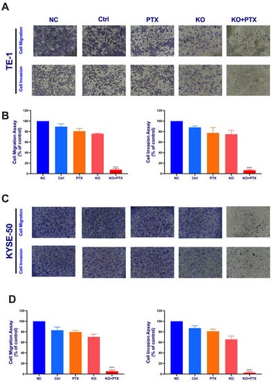 Chemoresistance is a significant challenge in the treatment of many cancers, including ESCC. To investigate chemoresistance, we established PTX-resistant cell lines (KYSE-50/PTX and TE-1/PTX) through the gradual exposure of parental cells (KYSE-50 and TE-1) to increasing doses of paclitaxel. These PTX-resistant cells served as the foundation for generating different experimental groups, including scramble gRNA as negative control (Ctrl) Clones, the Paclitaxel alone group (PTX), the KO Clones alone (KO), and the KO Clones with Combination Paclitaxel Treatment (KO + PTX). These distinct groups were employed in three metastatic potential assays: a cell migration assay, a cell invasion assay, and a wound healing assay. The objective of these assays was to unveil the influence of CtBP1 on the metastatic potential of PTX-resistant ESCC cells.