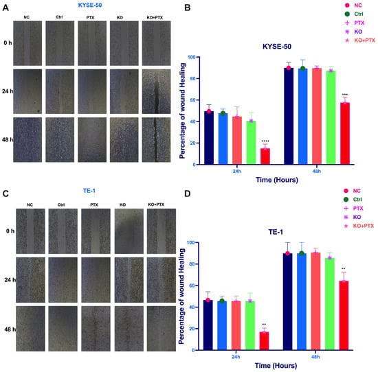Decelerated cell migration in CtBP1 knockout ESCC cells. (A) Representative bright-field images of KYSE-50 cells treated with KO + PTX showing a decrease in cell invasion into the cell-free region compared to the control group. (B) Summary bar graph illustrating the percentage of wound closure at indicated time points during the scratch wound assay in KYSE-50 cells. Treatment with KO + PTX resulted in a significant reduction in the wound closure percentage compared to untreated cells. (C) Representative bright-field images of TE-1 cells treated with KO + PTX showing a decrease in cell invasion into the cell-free region compared to untreated cells. (D) Summary bar graph illustrating the percentage of wound closure at indicated time points during the scratch wound assay in TE-1 cells. The graph shows the percentage of wound closure at different time points after treatment compared to controls. The images in panels (A,C) were captured at 10× magnification. Data are presented as mean ± SD of three independent experiments, each performed in triplicate. Statistical significance was assessed using a two-tailed Student’s t-test, and significance levels were indicated by the notation ** p < 0.01, *** p < 0.001, and **** p < 0.0001. A p-value less than 0.05 was considered statistically significant.