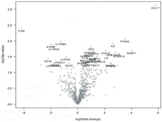 Most of the DEGs observed in the IMC-treated samples were involved in chemokine and cytokine signaling pathways, including CCL17, PTGS2, IL12RB2, IL6, S100B, CD4, IL13RA2, CXCL8, S100A12, NFKBIA, LIF, IL31RA, CCL20, CD40LG, SIGIRR, and IL18R1. Among them, CCL17, S100B, and SIGIRR appeared to be specifically associated with the chemokine and cytokine signaling pathways. Furthermore, the expression of CCL17 mRNA showed the highest increase after treatment (log2FC = 5.77). On the other hand, the lowest downregulation value was displayed by TLR5 (log2FC = −4.21), a member of the Toll-like receptor family (TLR).