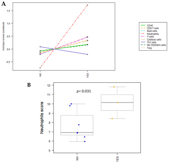 (A) Cell type profiling between IMC samples treated and untreated with eCPMV immunotherapy (NO: untreated IMC samples; YES: eCPMV-treated IMC samples). IMC-treated samples showed a remarkably higher neutrophil population than untreated samples among all the rest of the cell population. (B) Neutrophil subpopulations were significantly increased (p = 0.031) in treated IMC samples versus untreated IMC samples (p values estimated using Student’s t-test).
