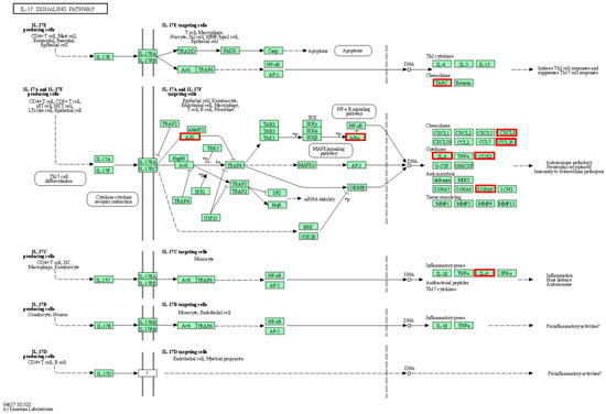 The IL-17 signaling pathway, which encompasses eight upregulated genes (NFKBIA, IL6, CXCL8, CCL20, TNFAIP3, PTGS2, CCL17, S100A9), includes five loci (CXCL8, S100A9, CCL20, PTGS2, and IL6) involved in the recruitment of immune cells, particularly neutrophils, to sites of inflammation (Figure 3). The CXCL8 gene encodes interleukin-8 (IL-8), which is a major cytokine that attracts and activates human neutrophils [31].
