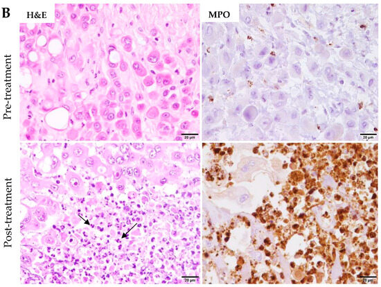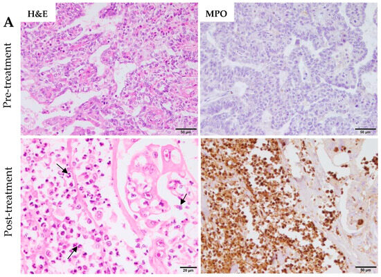 These findings at transcriptional level agree with our previous studies which established a strong neutrophilic tumor infiltration associated with necrosis, upholding neutrophils as drivers of tumor cell death [25]. In Figure 4A,B demostrated the large neutrophilic infiltration and associated tumor cell death (necrosis) in post-treatment samples as compared with pre-treatment tumor samples in two patients by hematoxylin and eosin (H&E) and MPO staining. In our previous results published [25], MPO expression was significantly higher in post- treatment than in pre-treatment tumor samples.