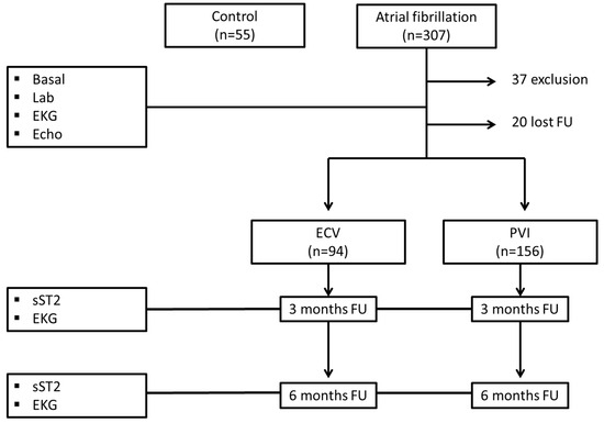 Flowchart of the study population. Lab.: laboratory test; EKG: electrocardiogram; Echo: echocardiogram; ECV: electrical cardioversion; PVI: pulmonary vein isolations; sST2: soluble ST2.