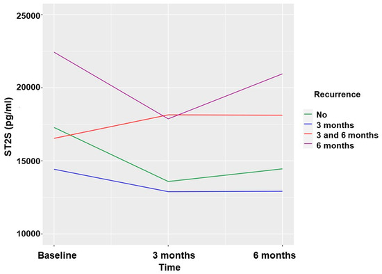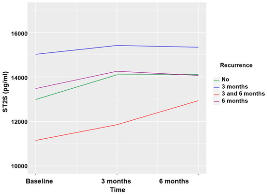 The sST2 biomarker results were analyzed according to the presence or absence of recurrence at follow-up (from basal to 3 months of follow-up, 3 to 6 months of follow-up, and up to 6 months of follow-up), as shown in Table 2.