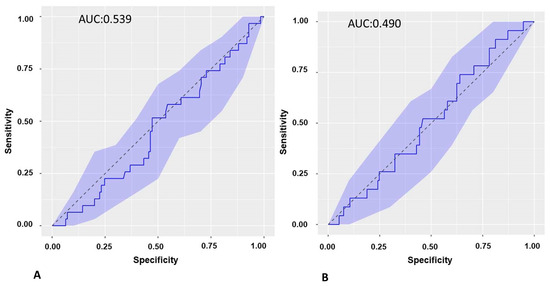 (A): ROC curve of the baseline sST2 in recurrence of AF at 3-month follow-up in the cohort of patients undergoing ECV. (B). ROC curve of sST2 at 3-month follow-up in recurrence of AF at 6-month follow-up in the cohort of patients undergoing ECV. ROC: receiver operating characteristic. ECV: electrical cardioversion.