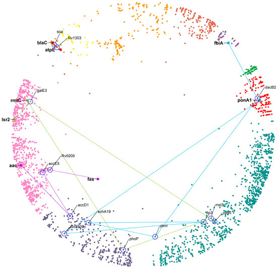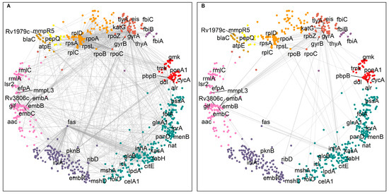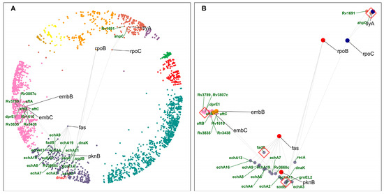 We focused our analysis on the small cumulative network of all DTs and their direct interactors. The DTs were observed to be involved in 1808 interactions (Figure 2A), including, to our surprise, 153 interactions between them (Figure 2B). For example, the MTB RNA polymerase (RNAP) responsible for transcription consists of multiple subunits α2ββ’ω encoded by rpoA, rpoB, rpoC, and rpoZ, respectively. These subunits interact to make the molecular assembly of RNAP and are reported as DTs targeted by rifampicin and its derivatives (Figure 2) [27]. Figure 2 shows the DTs positioned in nine of the eleven clusters and their direct interactors in ten of the eleven clusters. Cluster 2 “regulation of growth” (Figure 1, small green cluster at the top right) has no DT or direct interactor, strengthening the idea that this function remains an unexplored area for drug targeting.