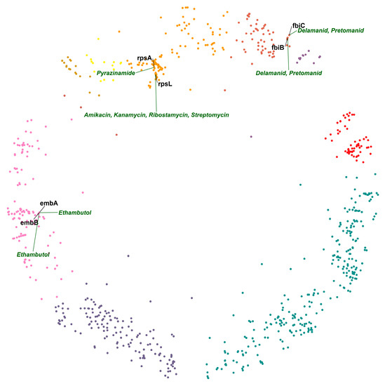 Hyperbolically close DT pairs present in their relevant clusters. The members of each of the two DT pairs, embA–embB and fbiB–fbiC, are targeted by the same drugs (ethambutol and delamanid/pretomanid, respectively), whereas the members of the DT pair rpsA–rpsL are inhibited by different drugs: pyrazinamide and aminoglycosides—cluster colors as in Figure 1.