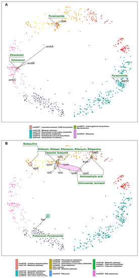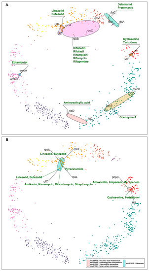 (A) DT pairs hyperbolically close, inhibited by the same class of drugs, and involved in the same pathways, processes, or complexes. The colored ellipses represent DT pairs or groups targeted by the same drugs, for example, ribosomal proteins participating in protein synthesis inhibited by linezolid and sutezolid; similarly, DT pairs part of the RNA polymerase complex targeted by rifampicin and its derivatives. (B) DT pairs that are components of the same pathways and are inhibited by two different classes of drugs. Drug classes and gene symbols are indicated—cluster colors as in Figure 1.