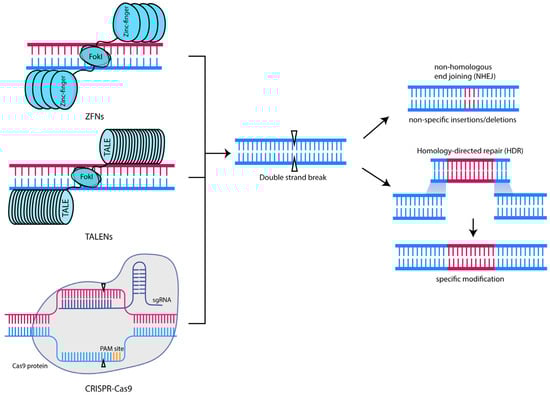 Zinc-finger nucleases (ZFNs) are chimeric restriction endonucleases comprising a DNA binding zinc-finger protein domain and a FokI catalytic domain []. The dimerization of the FokI catalytic domain is necessary for its function; thus, two sets of zinc fingers must bind to their target sequences in close enough proximity with the correct orientations []. Upon successful binding, DNA cleavage occurs, generating a double-stranded break (DSB) at the target site. DSBs can be repaired by nonhomologous end joining (NHEJ) or by homology-directed repair (HDR) (Figure 1).