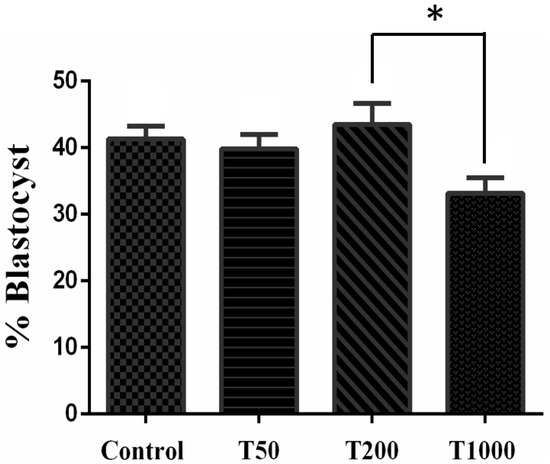 The effect of TUDCA concentrations on the percentage blastocyst. Results were least-squares means ± SEM. * p ≤ 0.1. Control = 0 µM of TUDCA; T50 = 50 µM of TUDCA; T200 = 200 µM of TUDCA; T1000 = 1000 µM of TUDCA.