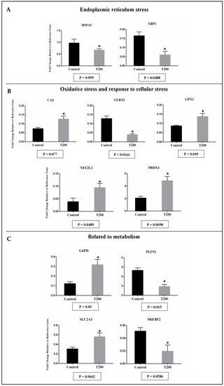The effect of TUDCA concentrations on mRNA abundance of candidate expressed genes in the embryo according to the following functional categories: endoplasmic reticulum stress (A), oxidative stress and response to cellular stress (B), and related to metabolism (C). Results were least-squares means ± SEM. The effect of treatment was * p ≤ 0.1 for all genes in the figure. Control = 0 µM; T200 = 200 µM.