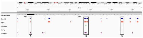 Peaks called at the chr8:9,024,498–9,084,425 locus. At the top of the figure, the entirety of chromosome 8 is represented with a very subtle red box demarking their locus, which is depicted below. Boxes A, B, and C highlight instances of congruent and incongruent peaks called from the alignments generated by the various aligner programs.