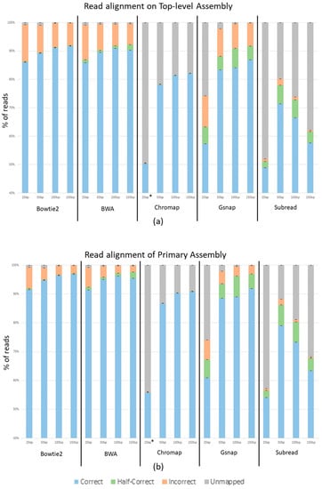 Percent of reads mapped correctly, half-correctly, incorrectly and unmapped. (a) shows reads generated from the top-level assembly aligned to the top-level assembly. (b) shows reads generated from the primary assembly aligned to the primary assembly. Each graph shows the percentage of reads that mapped correctly (Blue), half-correctly (Green), incorrectly (Orange) and unmapped (Gray). The aligner used and read length are designated on the x-axis. In both (a,b) the * denotes the use of non-default parameters.
