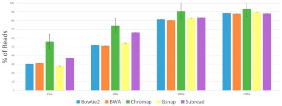 We suspected and wanted to test if the incorrectly mapped reads were caused by errors in the sequencing. ART builds in errors at a rate similar to known Illumina error rates and records these “sequencing errors” in the Perfect Alignment SAM file in the CIGAR score column. Thus, using custom scripts, we determined which of the sequence reads that did not align correctly (the incorrectly mapped reads) had “sequencing errors”. Figure 4 shows the percentage of the incorrectly mapped reads that have errors in the sequences, and we see that all the aligner programs reported similar rates. Chromap shows higher rates of incorrectly mapped reads that have errors. As might be expected, there is a trend that all aligners show that with longer reads come higher rates of incorrectly mapped reads that have errors, and that at the 150 bp read length, about 90% of the incorrectly mapped reads had “sequence errors,” confirming that as the read length increases, the propensity for error-free reads to align incorrectly drops dramatically.