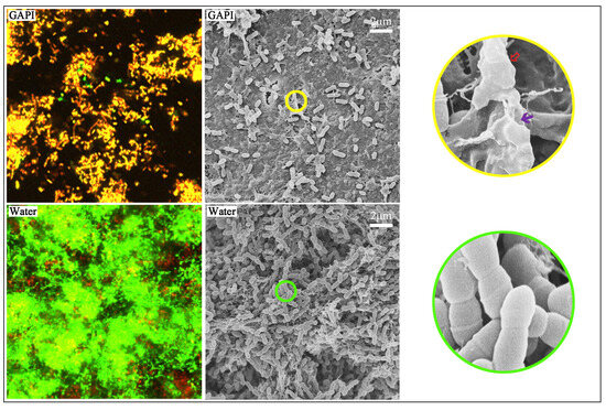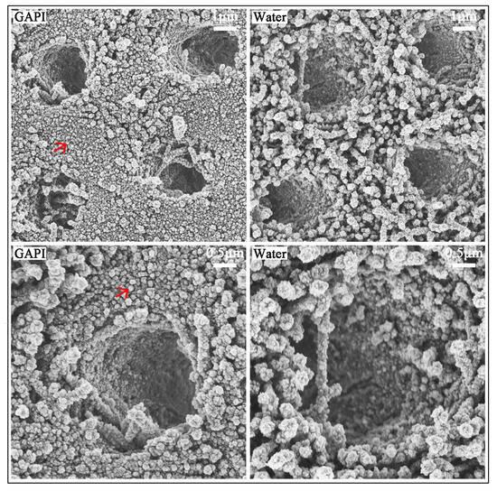 In the low-magnification scanning electron microscopy (SEM) images, the bacterial coverage on the dentin surface in the GAPI group was lower than that in the control group (Figure 2). In the control group, a three-dimensional S. mutans biofilm entirely covered the dentin surface, with the bacterial cells being tightly connected to each other. In the high-magnification SEM images, the GAPI treatment disrupted the bacterial structure, including a loss of normal bacterial cell morphology and damage to the bacterial cell membranes. Conversely, the bacterial cells remained intact in the control group.