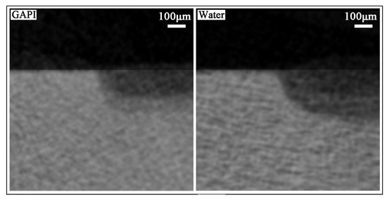 Micro-CT images of dentine lesion treated with GAPI (Left) and water (Right). The lesion depth for the GAPI-treated group was significantly lower than that in the control group (p < 0.001).