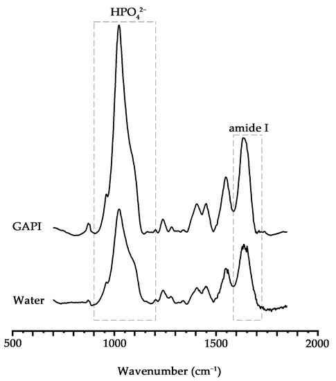 The average HPO42−-to-amide I ratios for the GAPI and control groups were 2.92 ± 0.82 and 1.83 ± 0.73 (p = 0.014). This indicates that the dentin in the control group experienced a greater mineral tissue loss than that in the GAPI group. Figure 3 displays the characteristic Fourier transform infrared spectroscopy (FTIR) spectra of both groups.
