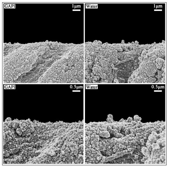 SEM images (×7000 and ×15,000) of dentine treated with GAPI (Left) and water (Right). In the GAPI group, the dentin surface was relatively smooth with the ball-form mineral nodes (