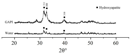 Figure 6 displays the typical characteristic XRD spectra of dentin. In the GAPI group, hydroxyapatite diffraction peaks (211, 300, and 310) were identified at 31.8°, 32.9°, and 39.8°. These peaks suggested the existence of hydroxyapatite crystals. In contrast, the spectra in the control group showed no prominent diffraction peaks.
