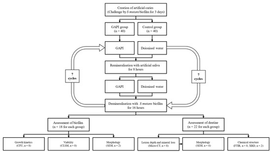 Two blocks from the same slice were assigned to the GAPI group (160 μM GAPI) and control group (deionised water) separately. All the blocks underwent a biochemical model involving chemical remineralisation and an S. mutans biofilm challenge for seven days. The remineralisation solution (pH 7.0) consisted of 1.5 mm calcium chloride, 150 mm potassium chloride, 0.9 mm potassium dihydrogen phosphate, and 20 mm 4-(2-hydroxyethyl)-1-piperazineethanesulfonic acid. The cycling process included 8 h of immersion in the remineralisation solution and 16 h of immersion in an S. mutans biofilm medium. Figure 7 shows the research protocol of this study.