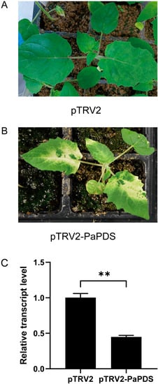 Silencing of PaPDS in Physalis angulata by VIGS. Representative phenotype of newly grown leaves of the infected control (A) and the PaPDS-silenced (B) P. angulata plants at around 14 days post-infection. (C) Real-time PCR analysis of the PaPDS transcript in the PaPDS-silenced leaves in comparisons with the controls. Difference was considered highly significant when ** p < 0.01.