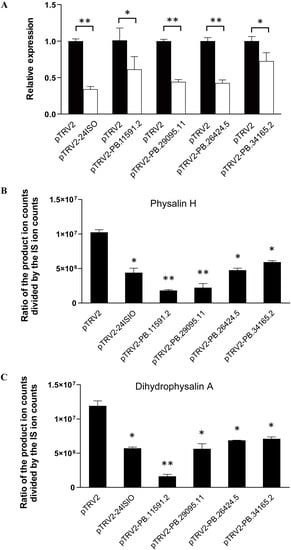 In planta silencing of the P450 candidates led to reduction in physalin biosynthesis in Physalis angulata. The 24ISO and the four P450 candidates (PB.34165.2, PB.26424.5, PB.11591.2, and PB.29095.11) were separately subjected to the VIGS experiment. (A), Transcript abundance of the targeted genes in their respective silenced leaves compared to the empty vector-transferred control; (B), The content of physalin H in the silenced P. angulata leaves compared with the empty vector control; (C), The content of dihydrophysalin A in the silenced P. angulata leaves compared with the empty vector control. Difference was considered statistically significant when * p < 0.05 and highly significant when ** p < 0.01.