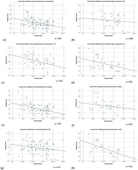 Scatter plots of linear correlation between walking time and CSF Aβ42 in all participants (a), age groups (b–d), sex groups (e,f) and cognitive groups (g,h).