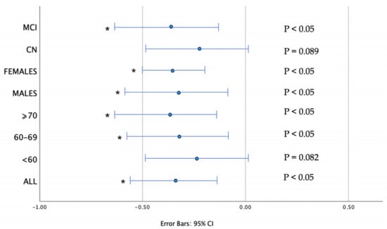 Simple (unadjusted) linear correlations between physical function parameters and CSF biomarkers are presented in Table 3. Walking time was inversely related to CSF Aβ42 in all subgroups (p < 0.05), except CN individuals and participants younger than 60 years old. Regarding grip strength, subgroup analysis showed a negative correlation with CSF Tau and CSF PhTau in males (p < 0.05). Scatter plots of the linear correlation between walking time and CSF Aβ42 in all subgroups are presented in Figure 1.