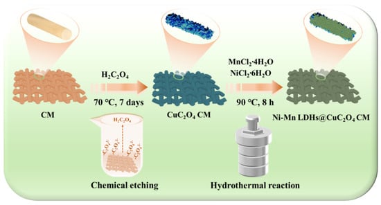 Schematic diagram of a two-step process for preparing Ni-Mn LDHs@CuC2O4 CM by chemical oxidation and hydrothermal deposition.