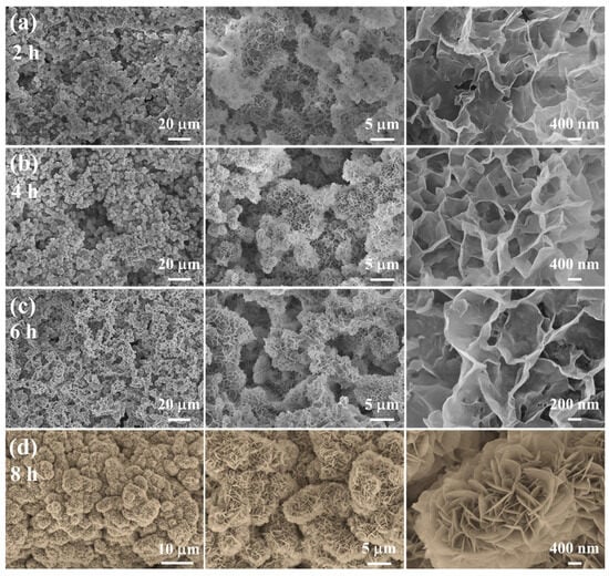 The representative SEM images of the as-prepared Ni-Mn LDHs@CuC2O4 CM at different hydrothermal times are shown in Figure 2. Compared with Figure S1, it is clearly observed that Ni-Mn LDHs nanosheets grow in situ on the CuC2O4 nanosheets and cover the CuC2O4 CM substrates completely after 8 h of hydrothermal reaction (Figure 2d). As the hydrothermal process proceeded for a specific time (i.e., 2, 4, 6, and 8 h) (Figure 2a–d), these Ni-Mn LDHs continuously grew to give rise to dense nanosheets with a height and a width not exceeding 10 μm. At a reaction time of 2 h, a delicate layer of Ni-Mn LDHs nanosheets forms on the CuC2O4 CM substrates (Figure 2a), signifying the successful construction of hierarchical nanostructures. With progressive increments in reaction time, a noticeable proliferation of Ni-Mn LDHs nanosheets becomes apparent on the mesh membrane, culminating in a more compact and comprehensive hierarchical arrangement (Figure 2b,c). Remarkably, at an 8-h reaction time, distinct particles comprised of Ni-Mn LDHs nanosheets densely populate the mesh membrane substrates (Figure 2d), thereby amplifying superhydrophilicity through increased membrane surface area and heightened surface roughness (Cassie Model). Furthermore, these nanosheets grow vertically, forming a grid-like staggered structure, which provides abundant reaction sites for reversible Faraday redox reactions and a solid backbone for charge/electrolyte ion transport [23,24]. At the same time, due to the low height (about 1–2 μm) and the interconnected structure of the nanosheet, the contact between the electrode material on the surface and the collector is closer, which is conducive to improving the charge transport and electrochemical performance of the nanosheet.