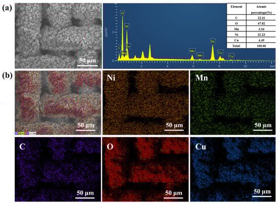 (a) The SEM image and corresponding element content, as well as (b) EDS mapping of Ni-Mn LDHs@CuC2O4 CM after 8 h hydrothermal reaction.
