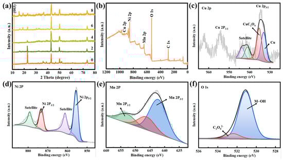 (a) XRD patterns of copper oxalate mesh after chemical oxidation reaction and Ni-Mn LDHs@CuC2O4 CM after hydrothermal reaction for 2, 4, 6, or 8 h. XPS spectrums of (b) wide scan, (c) Cu 2p, (d) Ni 2p, (e) Mn 2p, and (f) O 1s of Ni-Mn LDHs@CuC2O4 CM after 8-h hydrothermal reaction.
