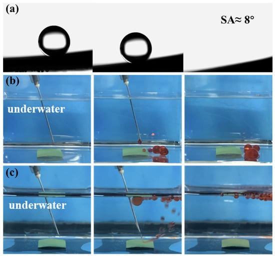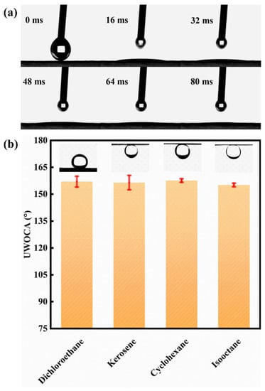 The selective wettability of the novel mesh membrane plays a vital role in efficient oil/water separation [26,27]. A hierarchical micro-nano rough structure with high surface energy was constructed on the mesh surface. Hence, a superhydrophilic/ underwater superhydrophobic surface was successfully formed. The wettability of the membrane was tested by the measurement of static (or dynamic) WCAs. Figure 5a shows that a water droplet can quickly spreading-wetting within 80 ms with a static WCA at 0° on the Ni-Mn LDHs@CuC2O4 CM surface. By contrast, the static WCA of pure CM was 90°, as shown in Figure S4. Similarly, Figure 5b shows that the underwater oil contact angles (UWOCAs) of all kinds of oil species are greater than 150°. Among them, the underwater OCAs of 1,2-dichloroethane, kerosene, cyclohexane, and isooctane are 157 ± 3°, 156 ± 4°, 158 ± 1°, and 155 ± 1°, respectively, indicating the superior underwater superoleophobicity of the Ni-Mn LDHs@CuC2O4 CM for general applicability. Additionally, an ultralow underwater oil sliding angle (UWOSA) (8°) can be realized on the surface of Ni-Mn LDHs@CuC2O4 CM (Figure 6a), which may imply an extreme underwater oil anti-adhesion property of the mesh. Thus, the oil anti-adhesion test was conducted. When red dichloroethane oil drops and kerosene oil drops were dropped onto the membrane under underwater conditions, the oil droplets bounced back quickly and fell off without adhering to the membrane (Figure 6b,c), which resulted from the low adhesion of oil droplets on the underwater superoleophobic surface of the Ni-Mn LDHs@CuC2O4 CM. All these phenomena directly confirm the excellent underwater oil anti-adhesion property of Ni-Mn LDHs@CuC2O4 CM.