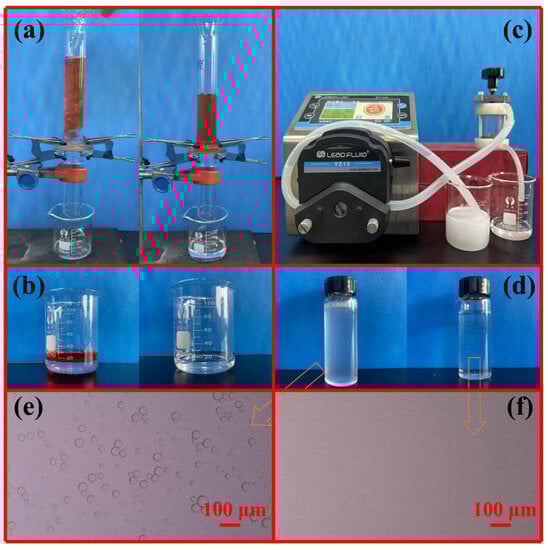 Photographs of the separation devices and results: (a) oil-water mixture; (c) oil-in-water emulsion; comparison before and after separation of (b) oil-water mixture and (d) emulsion, and (e,f) the corresponding optical micrograph of emulsion and filtrate.