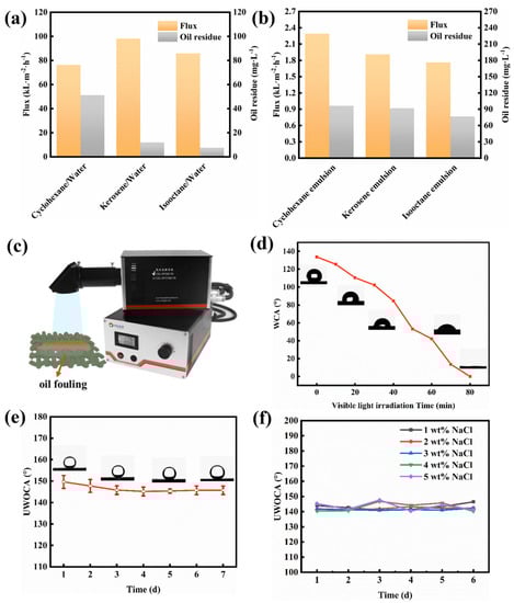 In practical applications, the stability of the membrane is very important for the separation system. Based on water and salt resistance, this study explores the long-term useability of the novel membrane in freshwater and saltwater environments. The membrane was placed in deionized water, and the underwater oil contact angle was tested every day. Furthermore, the membrane was immersed in 1% to 5% NaCl solution to test the salt tolerance. Comfortingly, whether in a water environment (Figure 8e) or a high-salt environment (Figure 8f), the meshes always maintained relatively stable underwater superoleophobicity (all UWOCAs > 150°), indicating a favorable chemical tolerance of Ni-Mn LDHs@CuC2O4 CM.