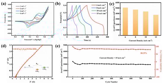 The electrochemical performance of Ni-Mn LDHs@CuC2O4 CM: (a) CV curves at different scan rates; (b) GCD curves at different current densities; (c) the specific capacitance based on GCD data; (d) Nyquist plots; and (e) long cycling test at 15 mA cm−2 for 800 cycles.