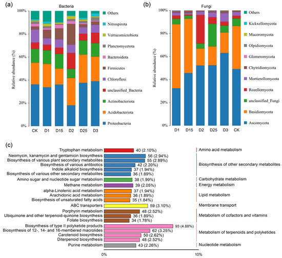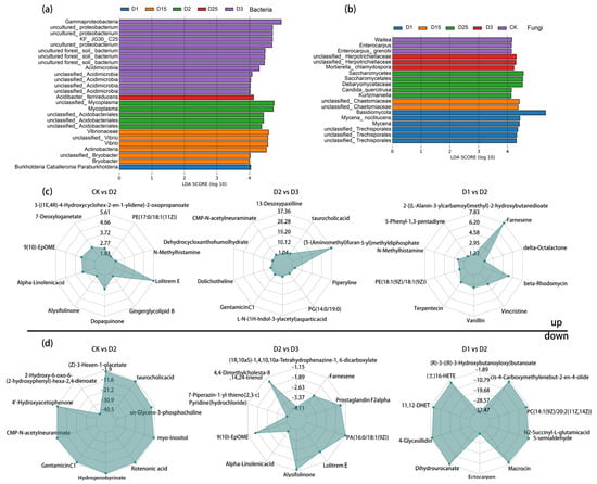 Non-metric multi-dimensional scaling (NMDS) and orthogonal projections to latent structure-discriminant analysis (OPLS-DA) were used to test the reproducibility of the microbiological and metabolic samples and to enable further in-depth analysis. The NMDS results showed complete separation of microbial samples under different CRF application conditions, as demonstrated in Figure S5a,b. Similarly, the degree of separation of the samples was indicated by the principal coordinates analysis (PCoA) based on the metabolic set, where PCo1 explained 74.71%, as shown in Figure S5c. To accommodate the high-dimensional nature of the metabolomic data, PLS-DA and OPLS-DA were applied to characterize the sample separation and initial screening of differential metabolites between all of the samples and selected paired comparison groups, respectively. The results showed that all treated replicate samples were discriminatory based on metabolite expression (Figure S6). Meanwhile, in the comparison groups of D25 vs. D15 and D3 vs. D1, replicate samples under the corresponding CRF application conditions were similarly significantly separated based on metabolite expression (Q2Y > 0.5). The reliability of the OPLS-DA model was demonstrated by the multiple modelling scatterplot after the permutation test (Figure S7). Under stringent LDA screening conditions, the bacterial groups Gammaproteobacteria, Acidimicrobia, Acidibacter_ferrireducens, Mycoplasma, Vibrionaceae, Vibrio, and Bryobacter were identified as being able to distinguish between different biomarkers of CRF application (Figure 2a). The fungal group showed the prominence of Waitea, Enterocarpus, Herpotrichiellaceae, Saccharomycetales, Debaryomycetaceae, Candida_quercitrusa Kurtzmaniella, and Mycena_noctilucens (Figure 2b).