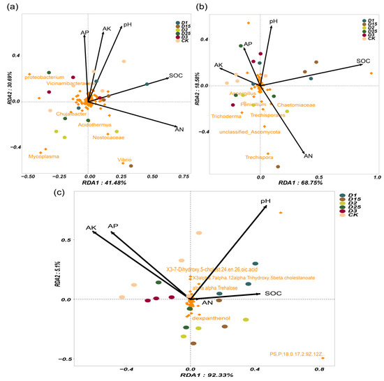 Redundancy analysis based on bacterial (a) and fungal (b) genus level and RDA based on metabolites (c). Different colors represent replicate samples under different CRF application conditions. Arrows represent conventional soil nutrients in the sugarcane root zone, and their lengths represent the magnitude of the correlation. The microbial relative abundance and metabolite expression abundance the top 200 were retained and are labelled in orange.