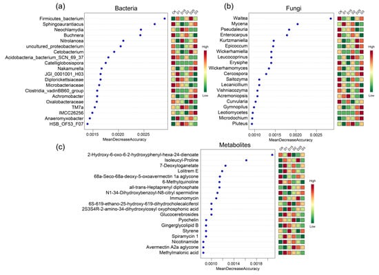 A randomized forest approach was used to screen for the bacterial genera (a), fungal genera (b), and metabolites (c) that contribute to the variability of different CRF applications. Horizontal coordinates are the mean importance, vertical coordinates are the microbial genera or metabolites, and heatmaps show the variability in microbial genus abundance or metabolite abundance between treatments, with the top 20 features of importance shown.