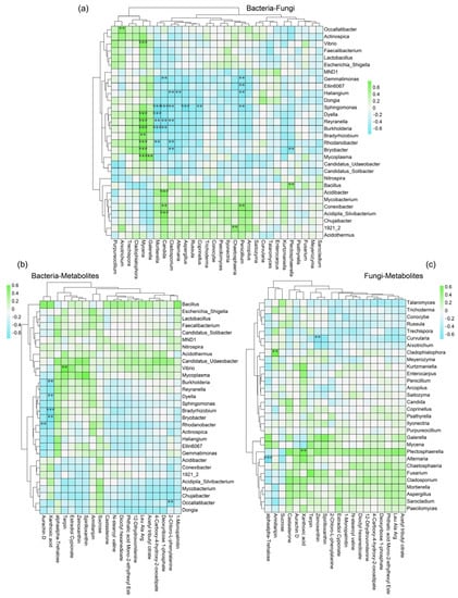 Heatmap of the correlation between two factors in the bacterial−fungal metabolite set based on Spearman’s correlation coefficient. Bacteria and fungi are the clearly identified microbial genera and belong to the top 30 with the highest degree of correlation. Similarly, the metabolites with the highest degree of correlation (top 20) were used for heatmapping. |r| > 0.6, p value indicates the level of significance, ** p < 0.01, *** p < 0.001. Correlations include bacteria−fungus (a), bacteria−metabolites (b) and fungi−metabolites (c). Blue indicates a negative correlation and green indicates a positive correlation.