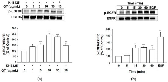 Effect of gintonin on epidermal growth factor receptor phosphorylation in HaCaT cells. (a) Cells were serum-starved for 4 h and then incubated with serum-free medium containing gintonin (GT, 1–30 μg/mL) for 30 min in the presence or absence of lysophosphatidic acid (LPA) receptor inhibitor Ki16425 (10 μM). (b) Cells were serum-starved for 4 h and then incubated with serum-free medium containing GT (10 μg/mL) for the indicated times or epidermal growth factor (EGF, 4 ng/mL) for 5 min. (a,b) Cell lysates in each test were immunoblotted using corresponding antibodies. Each upper panel shows the representative images of immunoblotting. Lower statistical graphs represent results expressed as a percentage of untreated control cells. Data are presented as means ± S.E.M. (n = 4); ** p < 0.01; *** p < 0.001 vs. untreated control cells; ## p < 0.01 vs. GT 10 μg/mL alone. p-EGFR, phospho-EGF receptor.